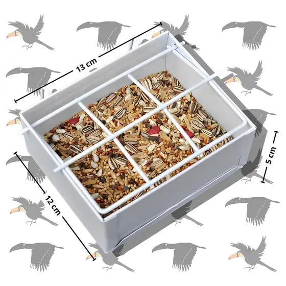 Com capacidade de 500ml e design funcional com grade protetora, evita que o animal entre no pote e suje o alimento. Produzido em aço pintado com tinta epóxi branca, é resistente, fácil de limpar e ideal para uso diário em viveiros e gaiolas.